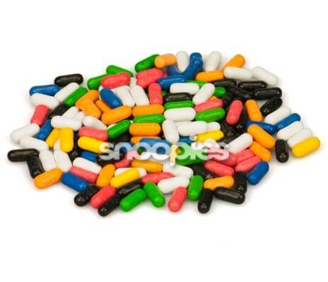 suiker, melado, tarwebloem, zoethoutwortelextract, gemodificeerd zetmeel, glucosestroop, gelatine, maltodextrine, kleurstoffen (E120, E131, E132, E153, E160a, E171), aroma's, stabilisator (E471), plantaardige olieen (kokos, palm), glansmiddel (carnaubawas, bijenwas).