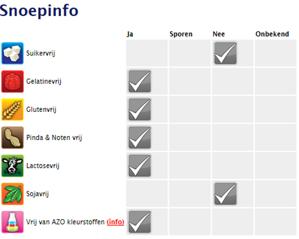 glucosestroop, suiker, palmolie, appelzuur, mono- en diglycerides, gehydrogeneerde katoenzaadolie, zout, sojalecithine, natuurlijk aroma, E129, E102, E133.