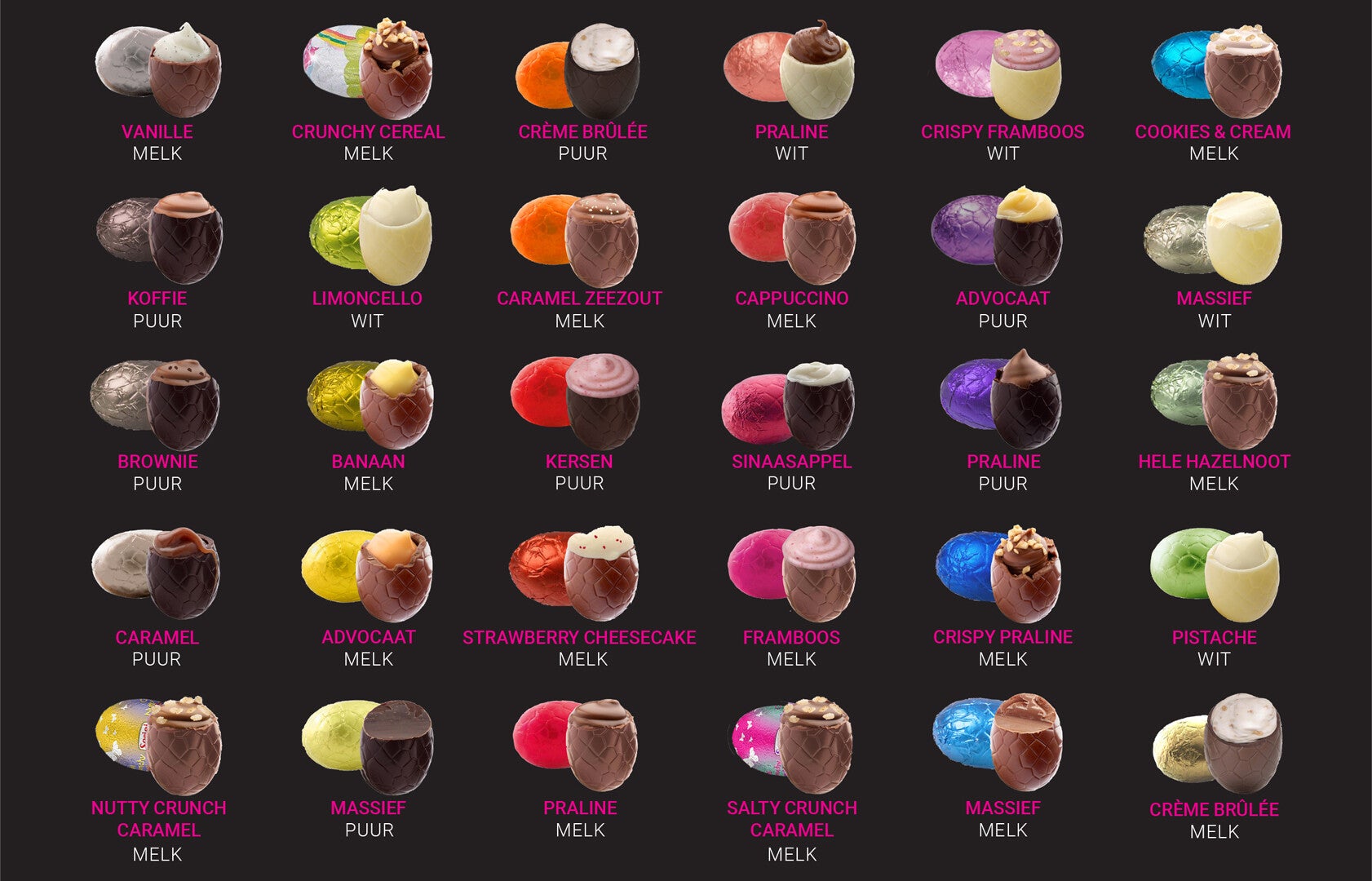 Dit paaseidoosje wordt dan gevuld met 30 verschillende paaseitjes van topkwaliteit.